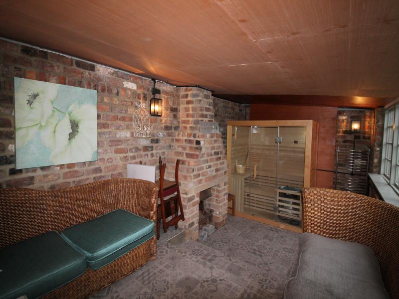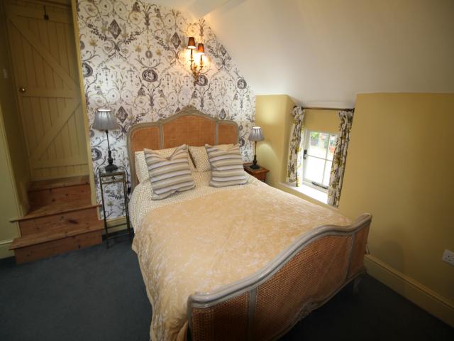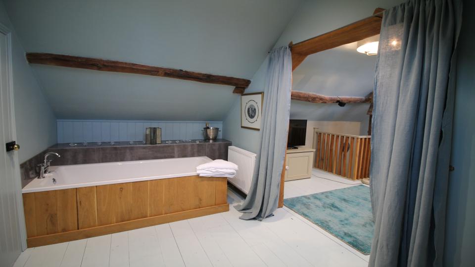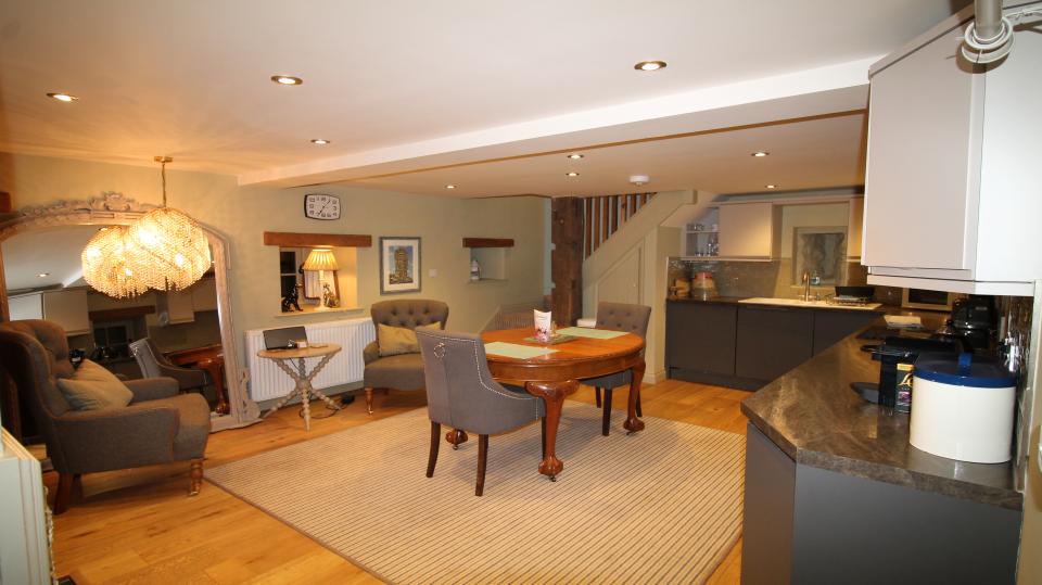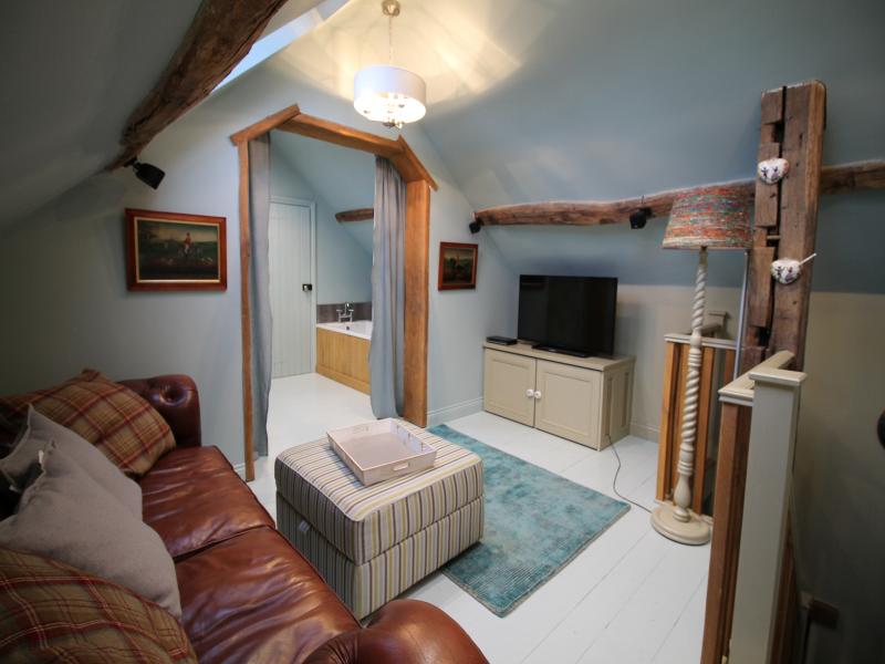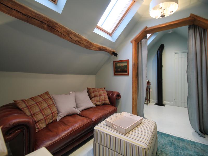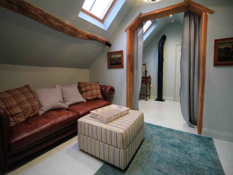 The Coach house is a luxurious and very characterful romantic cottage, which comprises of a large dining kitchen with beautiful contemporary units in lava and kashmir colours. This room is situated on the ground floor with period fireplace housing a log burner with two upholstered chairs in wool and leather, a Victorian mahogany dining table with linen dining chairs. A staircase leads to a sitting room with pine floor and very soft comfy leather Chesterfield sofa. This room has a large flat screen TV with Bose surround sound.