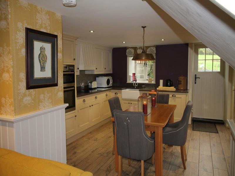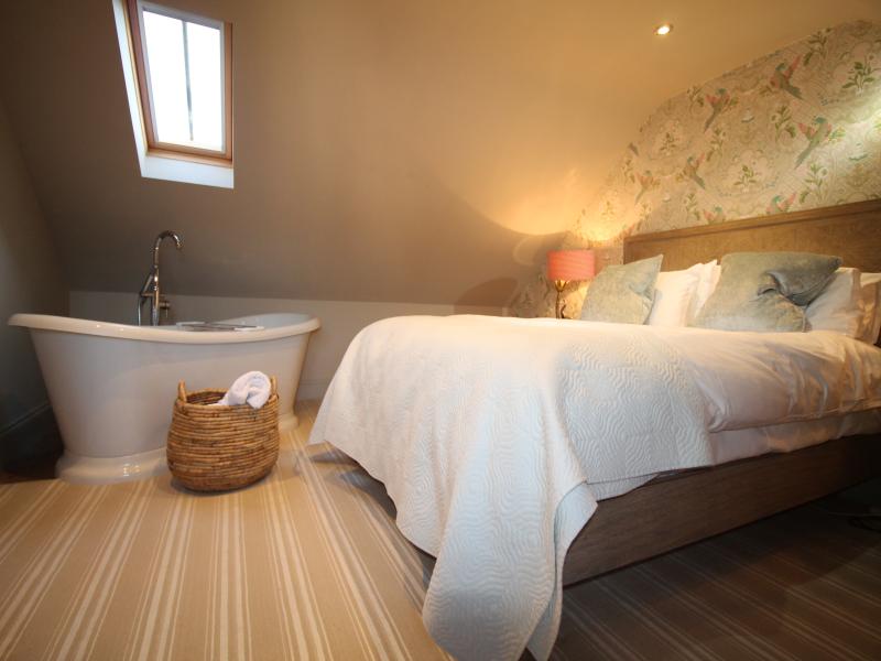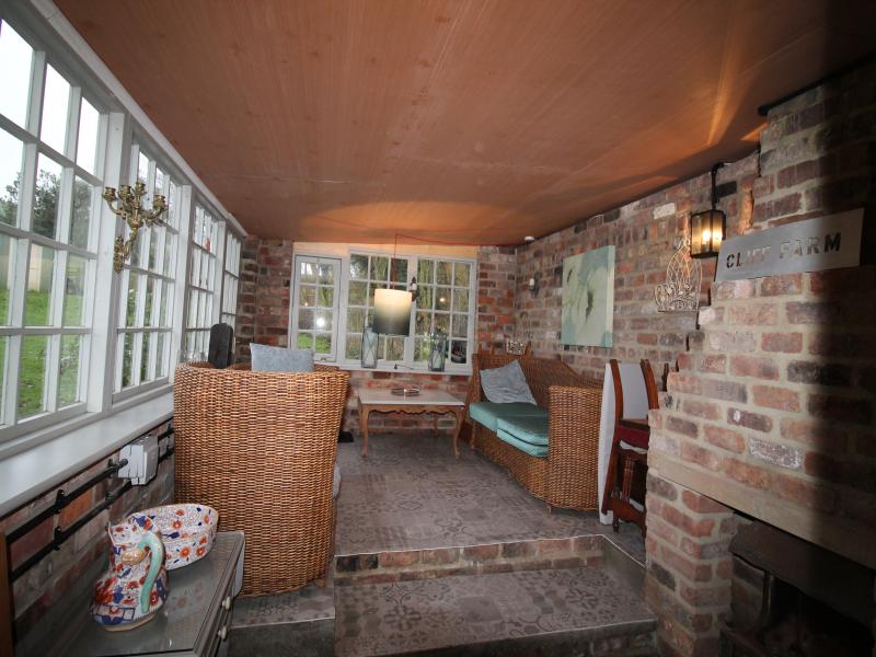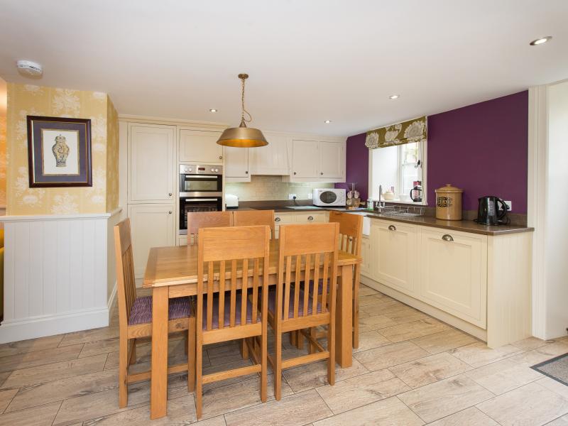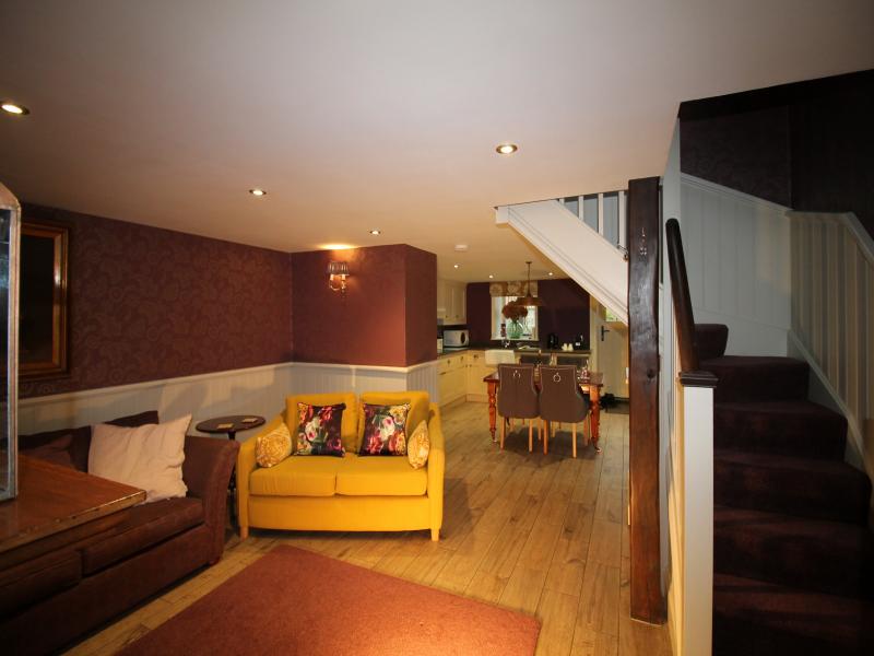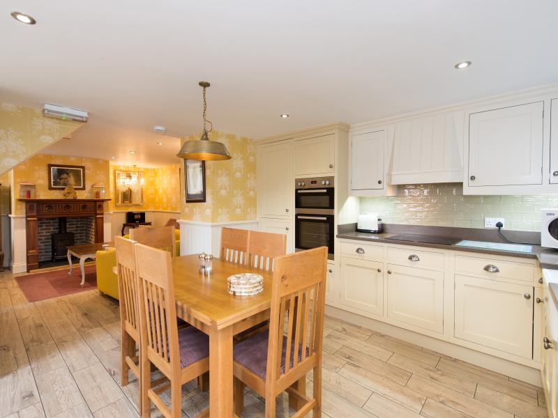 The bespoke kitchen is luxury, equipped to a high standard with a large dining table. This opens into a luxury sitting room with two comfy sofas around an antique fireplace housing a wood burning stove.